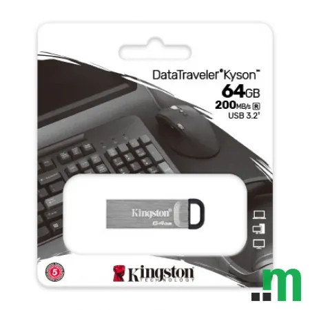 Kingston DataTraveler Kyson USB memorija kapaciteta 64GB nudi brzo i praktično prenošenje podataka putem USB 3.2 interfejsa. Elegantno metalno kućište bez poklopca čini je pogodnom za svakodnevnu upotrebu kod kuće, u školi ili na poslu.