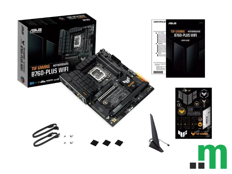 ASUS TUF GAMING B760-PLUS WIFI je ATX matična ploča zasnovana na Intel B760 čipsetu i LGA 1700 socketu, namijenjena za moderne Intel procesore i DDR5 memoriju. Donosi bogate mogućnosti povezivanja, uključujući Wi‑Fi 6E i 2.5Gb LAN, za stabilnu mrežu u igrama i svakodnevnom radu.