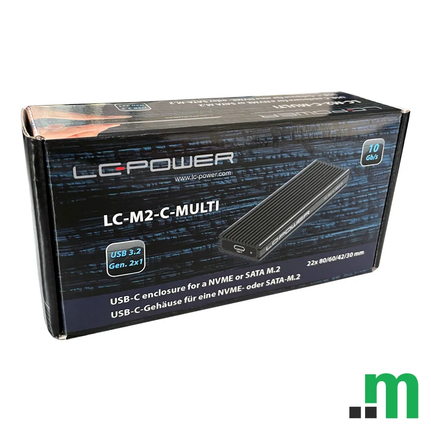 LC-Power LC-M2-C-MULTI-2 je eksterno kućište za M.2 SSD, namijenjeno za praktično korištenje i prenos podataka putem USB Type-C priključka. Pogodno je za korisnike koji žele pretvoriti M.2 SSD u prenosni eksterni disk.